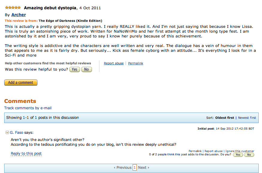 Gosh, does this kind of remind you of events that have happened to others in the past? I can think of one author who reported a bully review via GR’s reporting system and was banned from Goodreads for doing so: