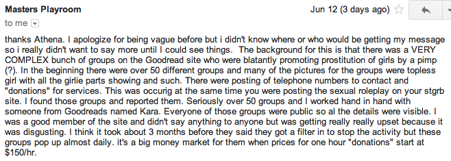On a side note, we wanted to share a couple other messages we received from visitors regarding the Badly Behaving Goodreaders, troll bloggers and the Amazon fora trolls:
