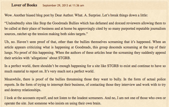 What I find absolutely hilarious about this is that Jane Litte and her gang of gremlins probably thought last year that STGRB would fade away into nothingness after a few months. Now, Jane’s not even on Goodreads anymore thanks to the efforts of this site. And she’s whining about what’s happened on her blog, trying to create a media storm to get others to join her and her pals over at BookLikes. Sorry Jane, but you’ve lost your credibility, if you even had any to begin with. You are no longer the mob boss you think you are.