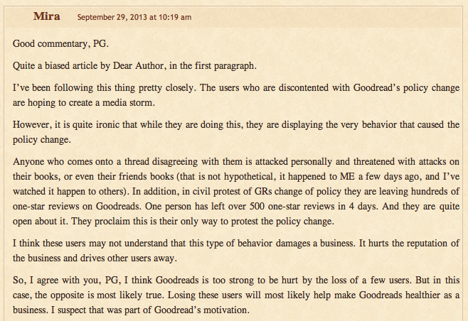 I read Jane’s post, too, and I tried to be unbiased while reading it, which wasn’t easy. The thing that surprised me the most was how Jane and many of the people who commented on her post seemed to feel that Goodreads is falling apart as a result of all this. How presumptuous is that?