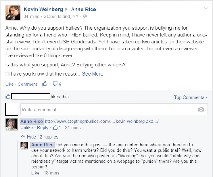 Unbelievable! This guy really doesn’t know when to stop! He keeps digging himself in deeper and deeper. Apparently, Kevin Weinberg, aka Parogar, went over to Anne Rice’s Facebook page and tried to make… yes MAKE Anne Rice renounce her support of our site. He says that if she does, “I will consider this settled.” As if she isn’t just going to swat him away like an annoying little knat. We’ve seen a lot of online bullies, but we’ve never seen a bully with an ego this big. Wow!