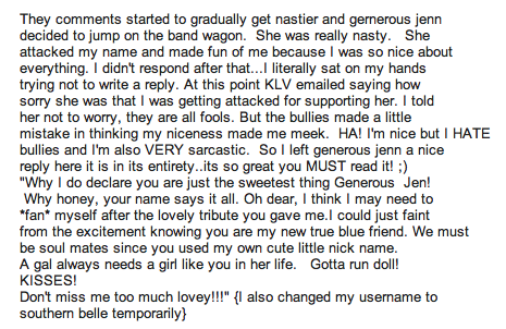 Now, if you have the time (and the patience) to read some of the comments on B&B’s post, the bullies seem to be complaining about the “poison in the water” these days, but what they don’t understand is that they are the ones who put the poison there in the first place. There are, however, a couple of them like Grim who’ve realized that by letting go of the whole BBA crusade, their lives are much happier (a fact we’ve been trying to get across to them ever since we started our blog):